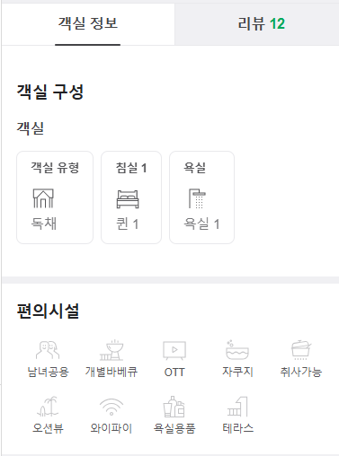 - 구성: 침실 2, 거실 1, 욕실 1, 야외 자쿠지, 앞마당(바베큐), 뒷마당(버너 취사)