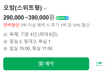 - 가격: 비수기 주중 290,000원부터, 주말 480,000원부터