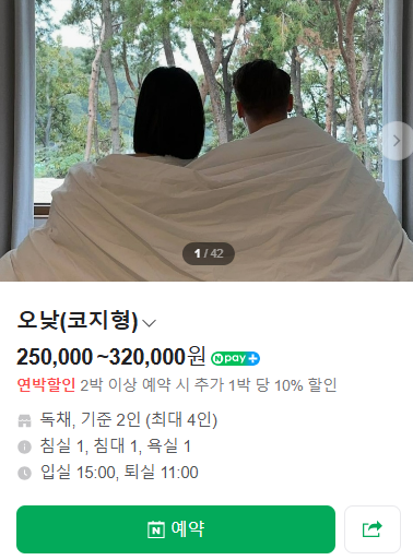 - 가격: 비수기 주중 250,000원부터, 주말 420,000원부터