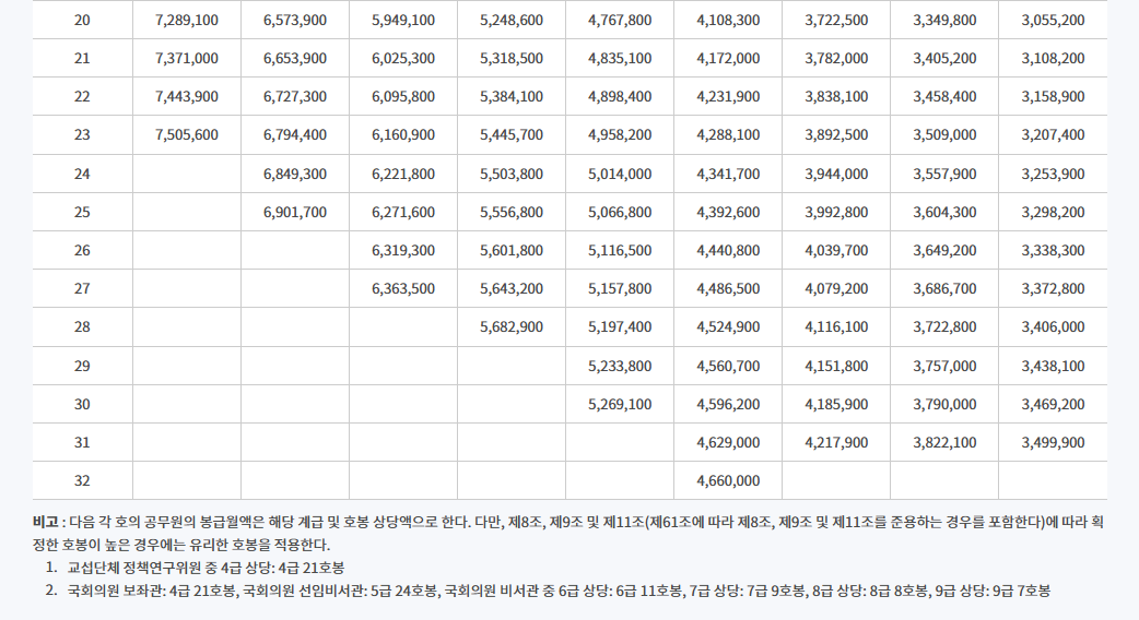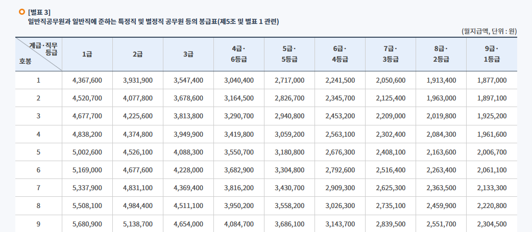 2025년 공무원 봉급표 (일반직 공무원과 그에 준하는 특정직, 별정직 공무원)