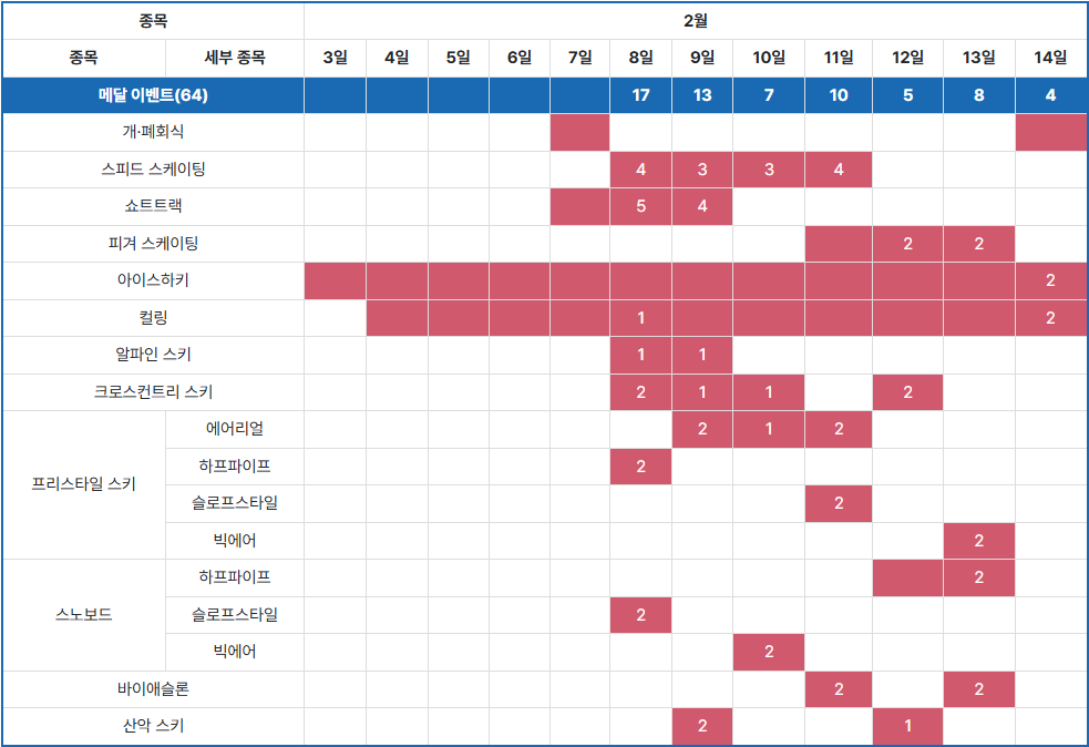 - 피겨스케이팅: 싱글, 페어, 아이스댄스 등 4개의 금메달이 걸려 있으며, 2월 12일부터 14일까지 경기가 진행됩니다.